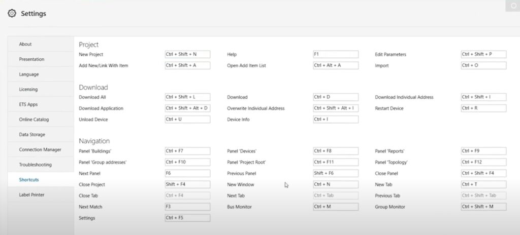 Wil je sneller door ETS6 navigeren en handelingen met minder klikken uitvoeren? Maak dan gebruik van sneltoetsen. In ETS6 kun je via het instellingenmenu > Shortcuts standaardtoetsen bekijken én aanpassen aan jouw voorkeur.